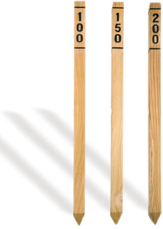 Afstandsmarkeringspæle i teaktræ (100 x 5 x 5 cm). Pælene er tilspidsede og uden metalspyd.