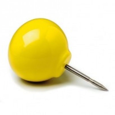 Pulverlakeret teemarkering i forststøbt aluminium. Markeringen kan tilpasses den enkelte kunde med forskellge layouts og logoer. Hovedstørrelsen er ø150mm i diameter, og bagved det runde hovede findes beholderen til broken tees.